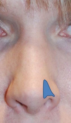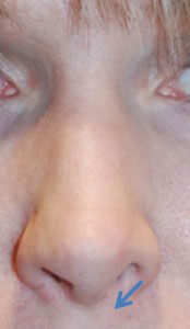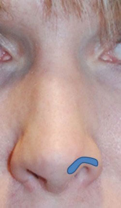 In the above example, the blue arrow shows the idea of advancing the nostril rim to lower the whole nose on the side to help the retraction more. This was caused by liberal resection of tissue on the side of the nostril often used to narrow the width of the nose in this area. The procedure to narrow the nose is often called a weir excision. The goal is to reverse the weir excision to a degree by advancing the nostril rim completely downward.